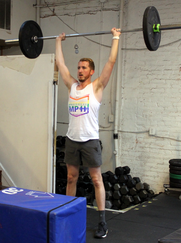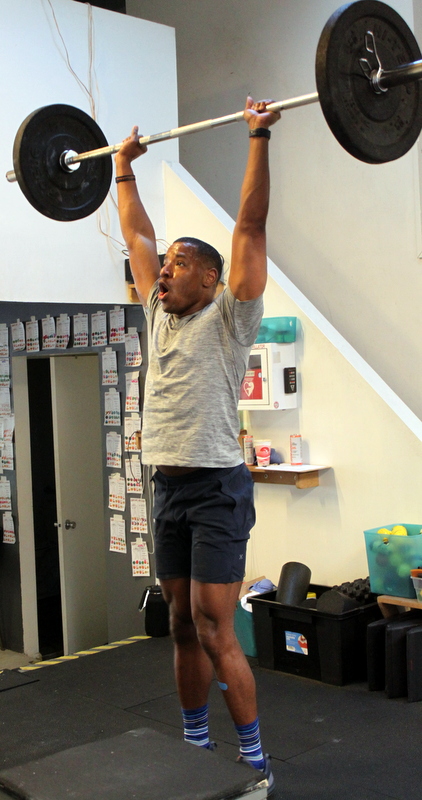 five rounds for time: 12x deadlift @ 165/115-lbs. 9x hang power clean 21x box jump @ 24/20″ platform
