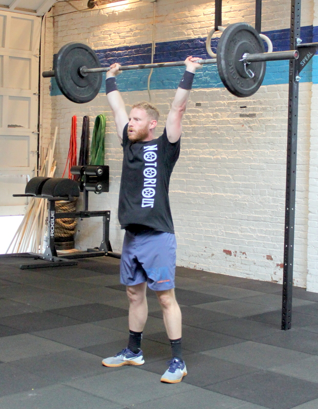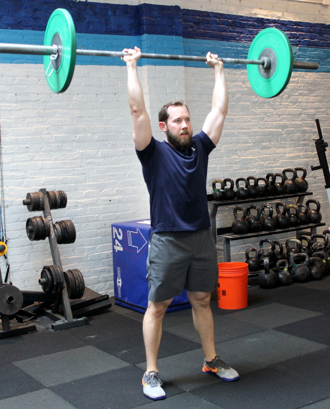 nine rounds for time: 6x strict pull-up 3x shoulder-to-overhead @ 185/135-lbs. 6x swing @ 70/55-lbs. 12x burpee “Outside The Box” nine rounds for time: 6x strict pull-up 3x strict handstand pushup 6x standing long jump 12x burpee Post score to comments.