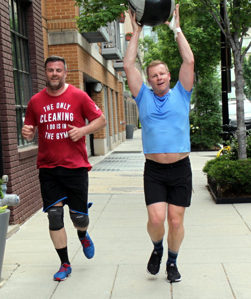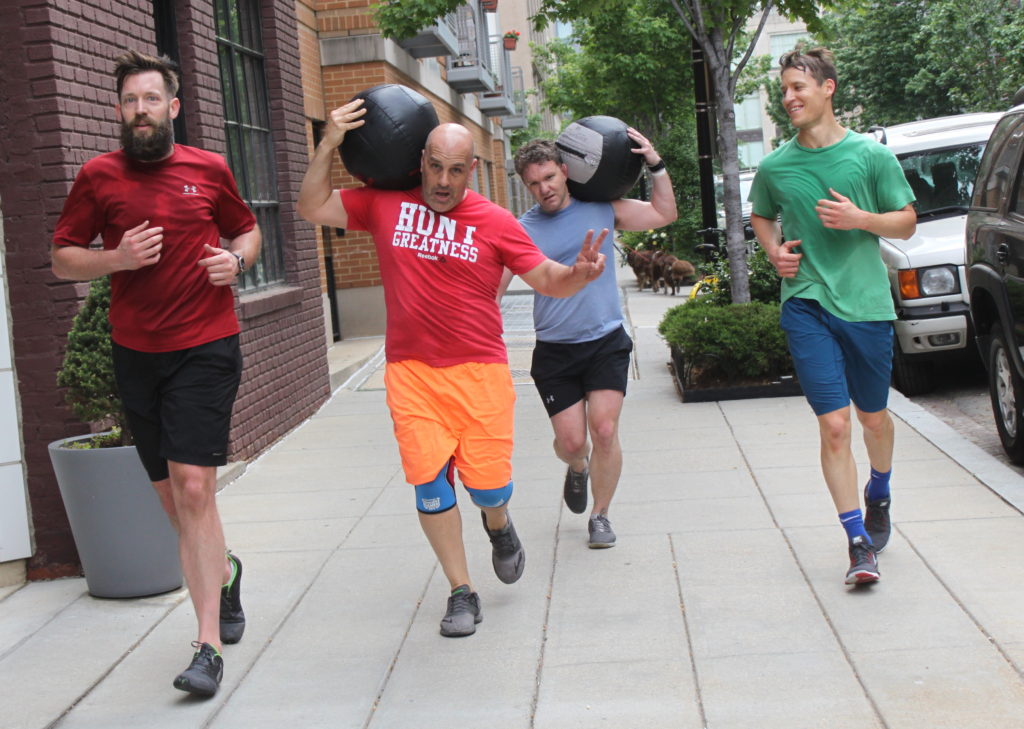 in teams of two, three intervals, rest while partner works: 1. 35 calorie row + 25x push press @ 95/65-lbs. + 200m run 2. 30 calorie row + 30x push press + 200m run 3. 25 calorie row + 35x push press + 200m run This workout runs in intervals. Partner one completes the entire […]