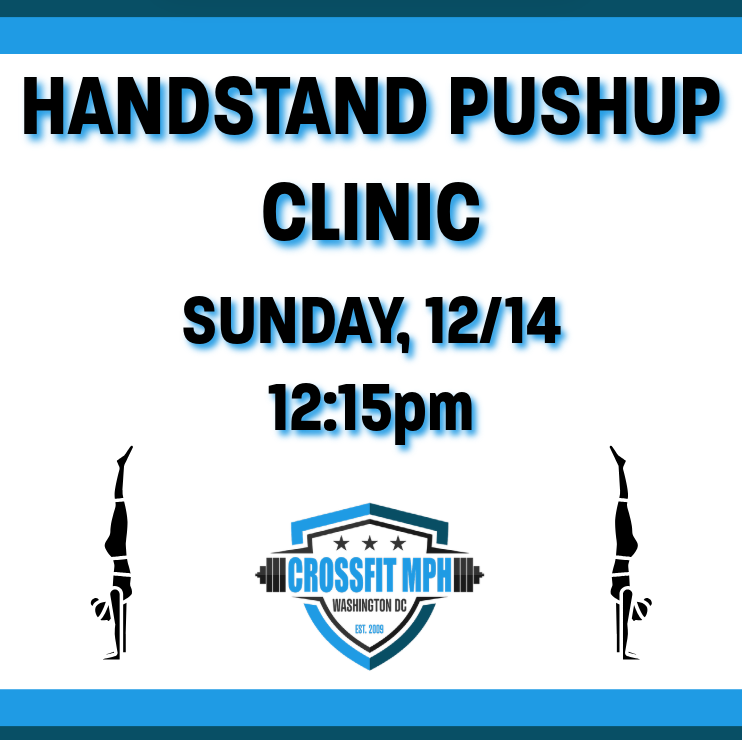 Registration is now open for our next gymnastics clinic, on Sunday, 12/14 at 12:15pm with Coach Al! We’ll go over movement progressions for strict handstand pushups. We will also work on the technique of kipping handstand pushups, and if you are advanced, practice some progressions on this skill, such as deficit or freestanding. Prerequisite for the handstand clinic is five consecutive pushups on your feet — sign up in Wodify now!
