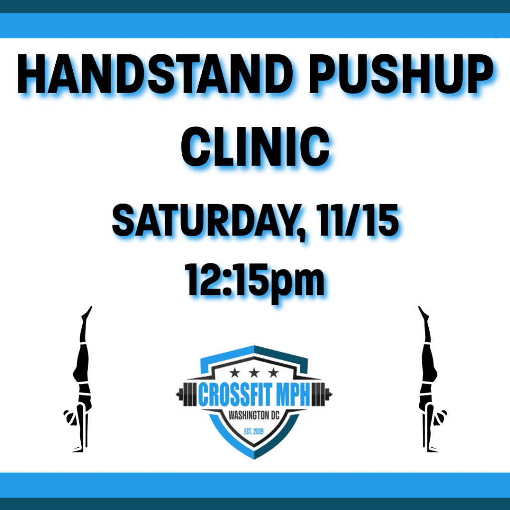 Registration is now open for our next gymnastics clinic, on Saturday, 11/15 at 12:15pm with Coach Al! We’ll go over movement progressions for strict handstand pushups. We will also work on the technique of kipping handstand pushups, and if you are advanced, practice some progressions on this skill, such as deficit or freestanding. Prerequisite for the handstand clinic is five consecutive pushups on your feet — sign up in Wodify now!