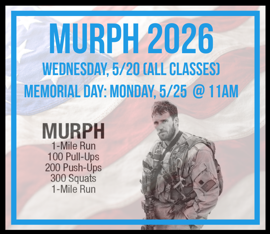 “Murph” is a CrossFit Hero workout honoring Lt. Michael Murphy. CrossFit gyms around the world do this workout on or around Memorial Day to honor fallen service members. You can read his incredible story here. This workout is all about the grind–it will be long (by design) and will challenge your pulling, pushing, and squatting stamina, as well as your cardiorespiratory endurance. We will have options for ALL levels–be sure to come to class! This workout will take anywhere from 25-55 minutes, and is programmed for all classes on Wednesday, 5/20 and at 11am on Monday, 5/25 (Memorial Day)