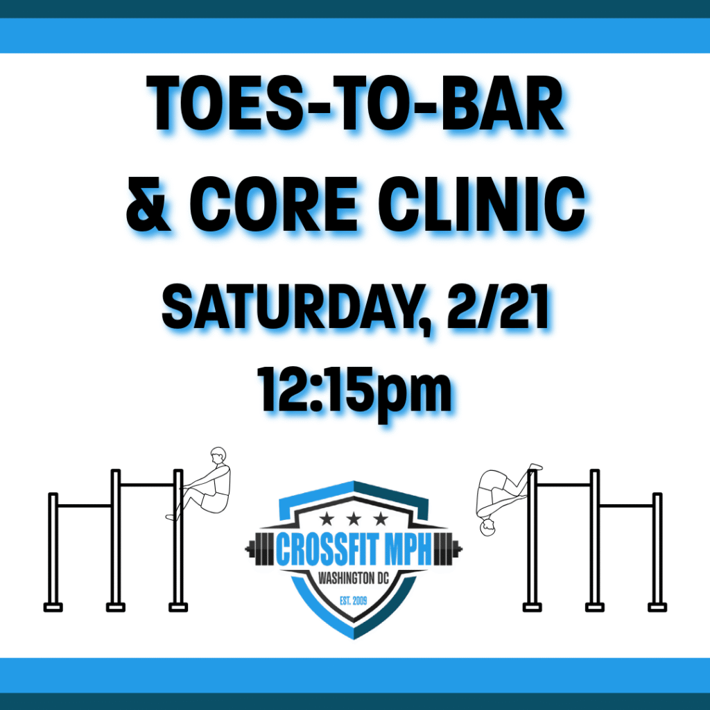 Registration is now open for our next gymnastics clinic, on Saturday, 2/21 at 12:15pm with Coach Al! We’ll go over movement progressions for toes-to-bar and work on movements to strengthen the core. Sign up in Wodify now!