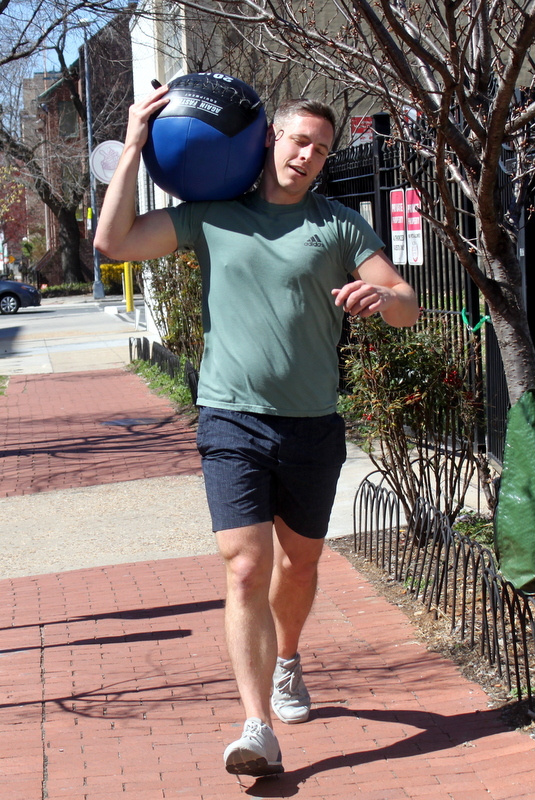 In Gym: Row for 16 minutes for maximum distance. At the top of every 2-minute interval, complete 15x wall ball. At Home: Complete as many burpees as possible in 16 minutes. At the top of every 2-minute interval, complete 15x single-arm thruster –or– 20x air squat