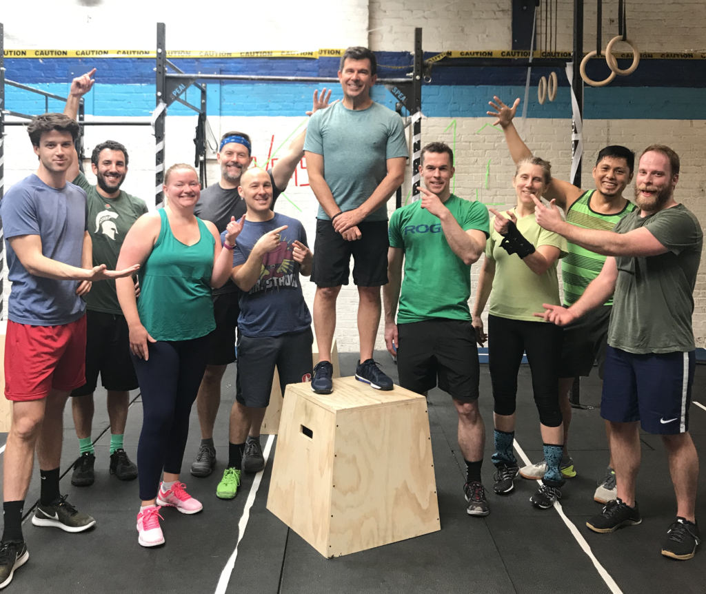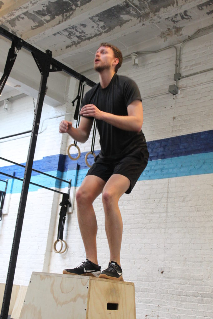 for time: 21-15-9 box jump, 30/24″ platform –or– tuck jump toes-to-bar –or– 2x pike-up/v-up then, for time: 21-15-9 standing long jump, 6/5-ft. strict ring dip –or– dip variation