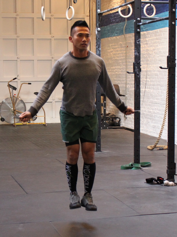 for time: 100x double under 21x front squat @ 115/75-lbs. 21x push press 100x double under 15x front squat 15x push press 100x double under 9x front squat 9x push press workout courtesy of crossfit.com