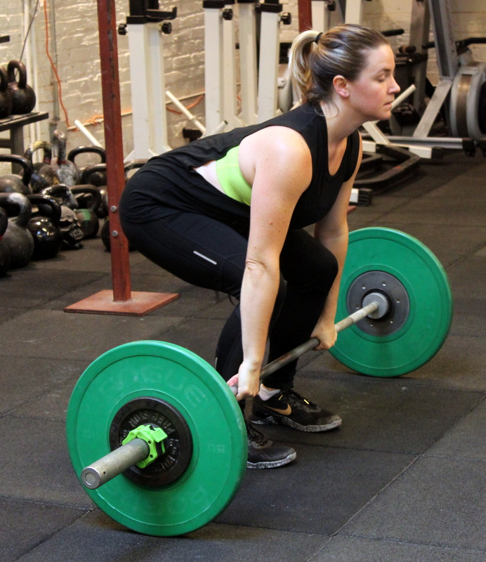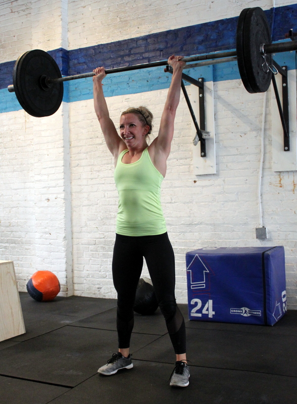 In Gym: five rounds, every 90 seconds: snatch pull + power snatch five rounds, every 90 seconds: 2 power snatch + 2 overhead squat At Home: as many rounds as possible in 12 minutes: 8x single-arm reverse overhead lunge, left 8x single-arm reverse overhead lunge, right 16x single-arm power snatch (alternating, total)
