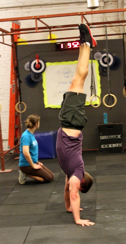 In Gym: for time: 18-16-14-12-10-8 power clean @ 135/95-lbs. *after each round, complete a 200m run. then, practice handstands and handstand walking for 10 minutes. At Home: for time: 18-16-14-12-10-8 object power clean –or– MPH-standard burpee *after each round, complete a 200m run –or– 50x jumping jack