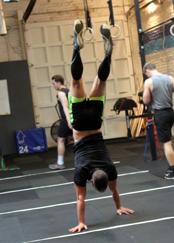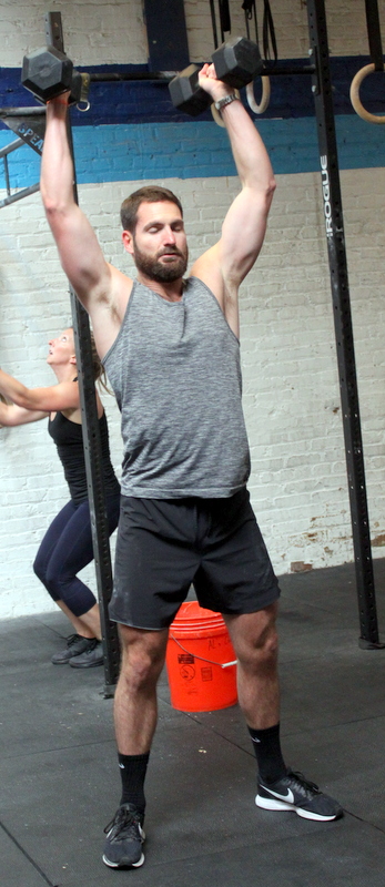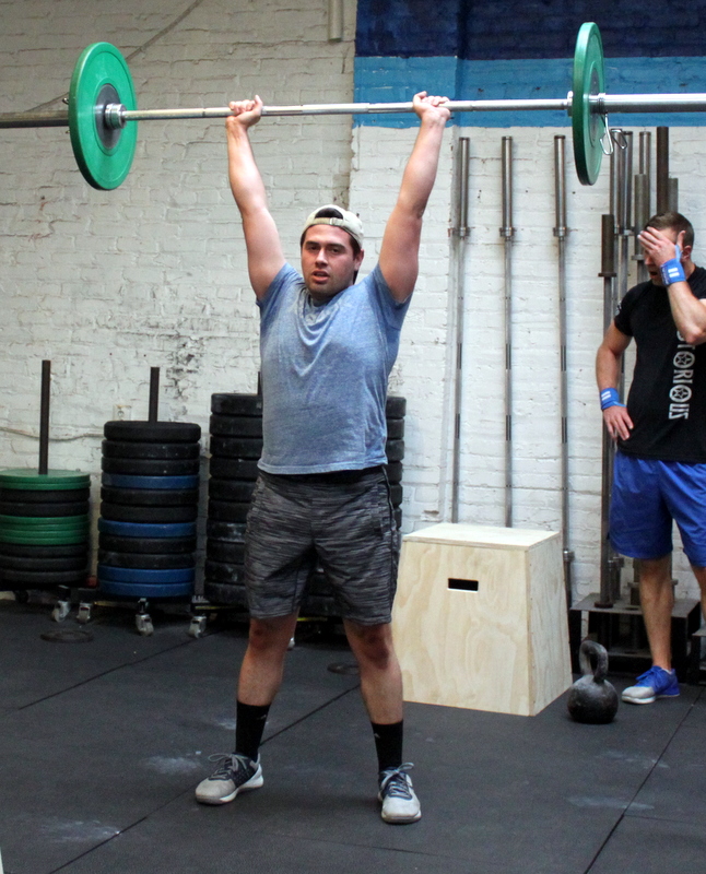 In Gym: for time: 50-40-30-20-10 single-arm overhead lunge @ 55/35-lbs. strict sit-up At Home: for time: 50-40-30-20-10 single-arm object overhead lunge –or– 1.5x lunge strict sit-up