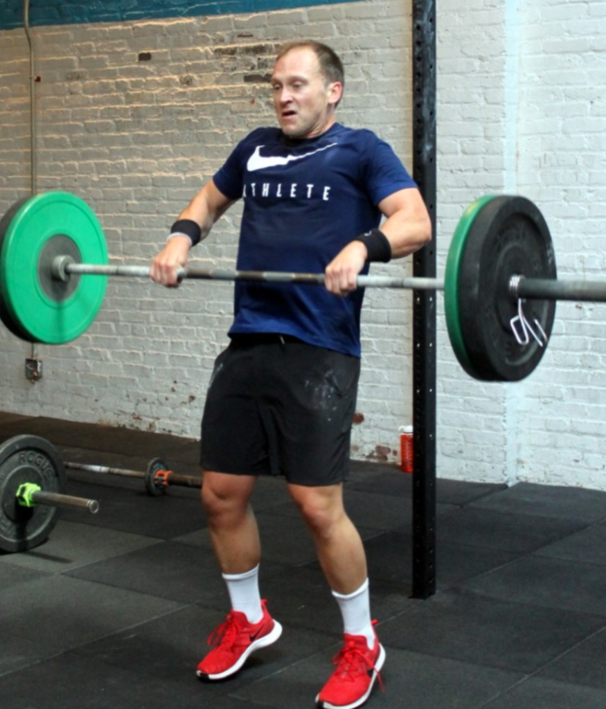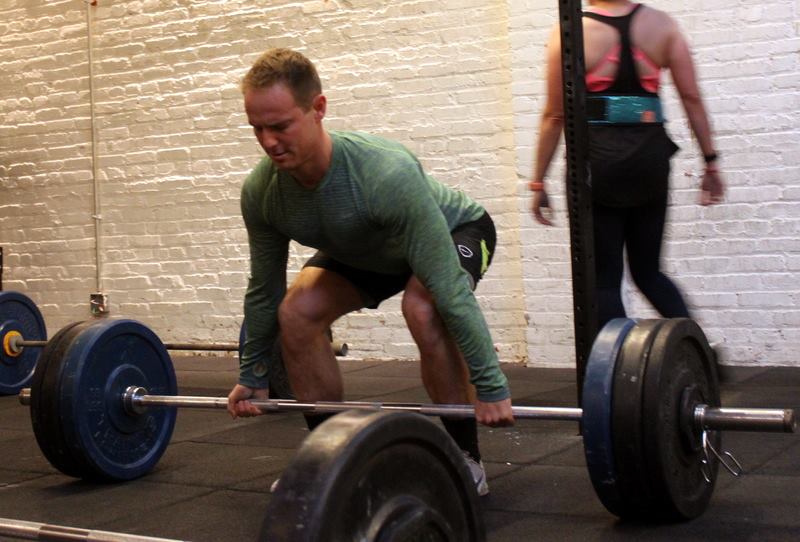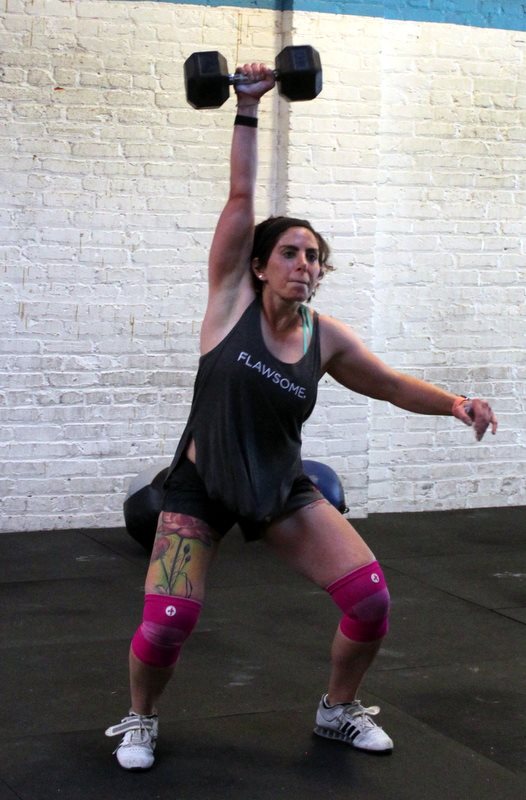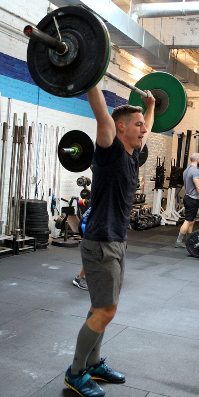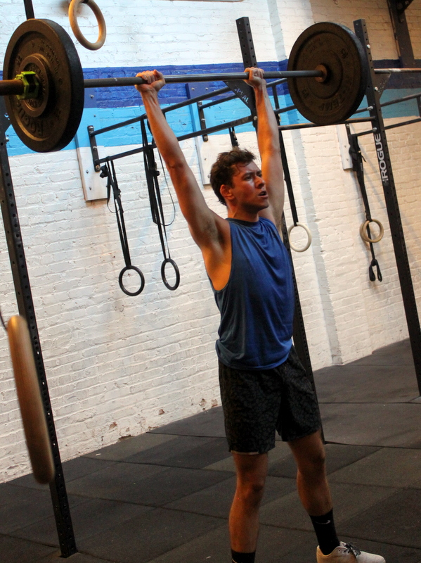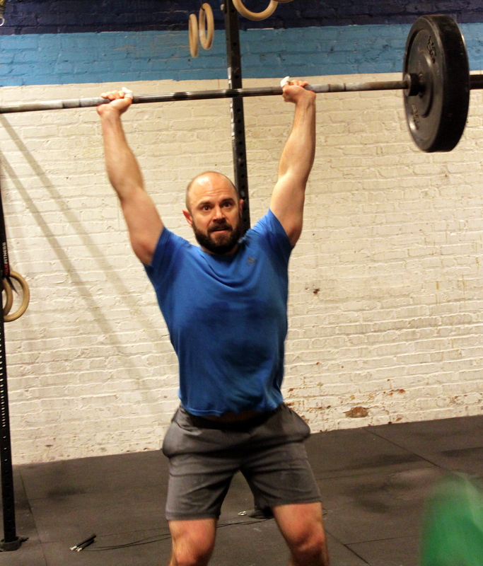 In Gym: five rounds for time: 8x hang power snatch @ 95/65-lbs. 8x overhead squat 10x (burpee + box jump, 24/20″ platform) At Home: five rounds for time: 12x single-arm object power snatch 8x single-arm overhead lunge 10x (burpee + tuck jump)