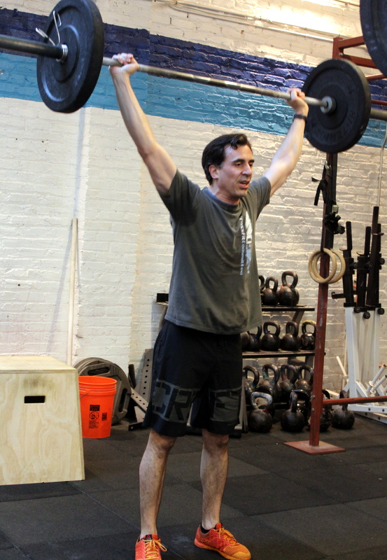 In Gym: three rounds for time: 25x pull-up 25x push press @ 75/55-lbs. 25x box jump, 24/20″ platform –rest one minute– At Home: three rounds for time: 15x strict pull-up –or– 25x sheet row –or– 25x rotational sit-up 25x object push press –or– 25x pushup 50x air squat –rest one minute–