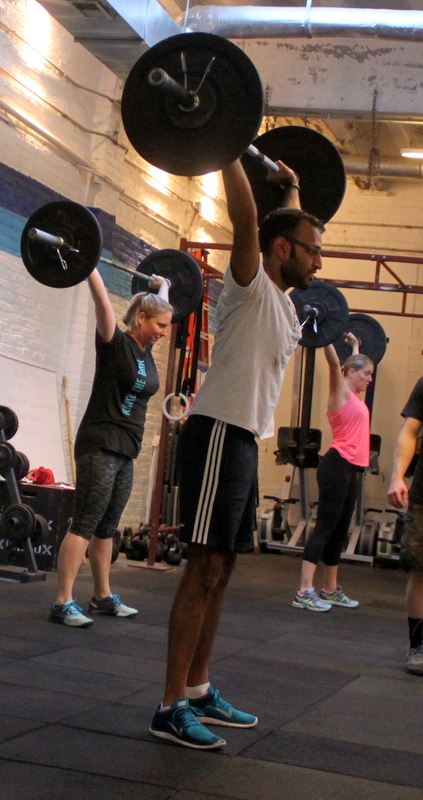 In Gym: three rounds for time: 15x dumbbell push jerk @ 50/35-lb. dumbbells 50x double under 25x weighted step-up @ 50/35-lbs. (one dumbbell) 50x double under At Home: three rounds for time: 15x object push press –or– atomic pushup 50x elevated toe tap 25x object weighted lunge –or– lunge jump 50x elevated toe tap