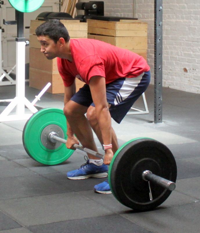 In Gym: five rounds for time: 15x deadlift @ 225/155-lbs. 20x box jump, 24/20″ platform At Home: five rounds for time: 15x object deadlift –or– inchworm 20x tuck jump