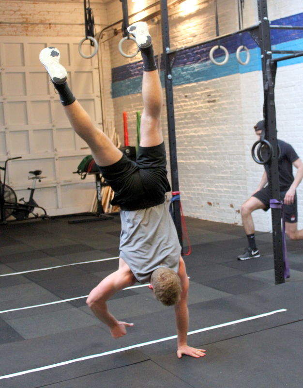 In Gym: for time: 3-minute handstand hold 75x strict sit-up 150-ft. handstand walk 75x strict sit-up 30x handstand pushup At Home: for time: 3-minute atomic hold –or– 3-minute handstand hold 75x strict sit-up 30x (inchworm + atomic pushup) 75x strict sit-up 30x atomic pushup