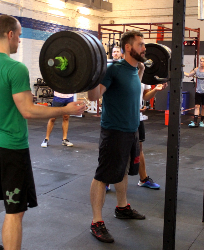 In Gym: five rounds, every three minutes: 10 heavy thruster five rounds, every two minutes: 3 heavy back squat At Home: five rounds, rest amply between rounds: 10x dumbbell/object thruster + max dumbbell front squat –or– 10 pause squat jump + max squat