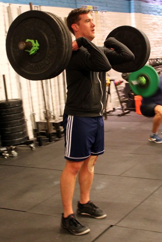 In Gym: front squat* 4-4-4-4-4-4-4-4 *Start each round every three minutes. At Home: three four-minute rounds, rest exactly one minute between rounds 1-minute plank hold 20x dumbbell/object squat –or– 20x air squat max time in wall squat hold