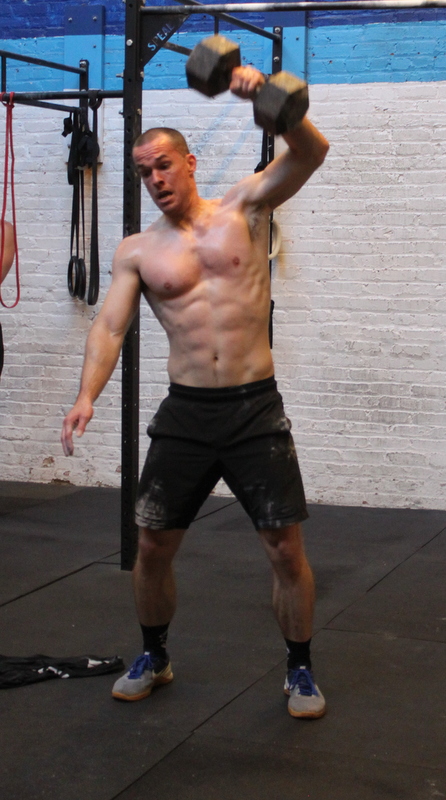 In Gym: 2 thruster + 2 push press 1-1-1-1-1 At Home: five rounds for time: 10x dumbbell/object thruster –or– 10x atomic pushup + 10x squat jump 10x dumbbell/object push press –or– 10-20x staggered grip pushup